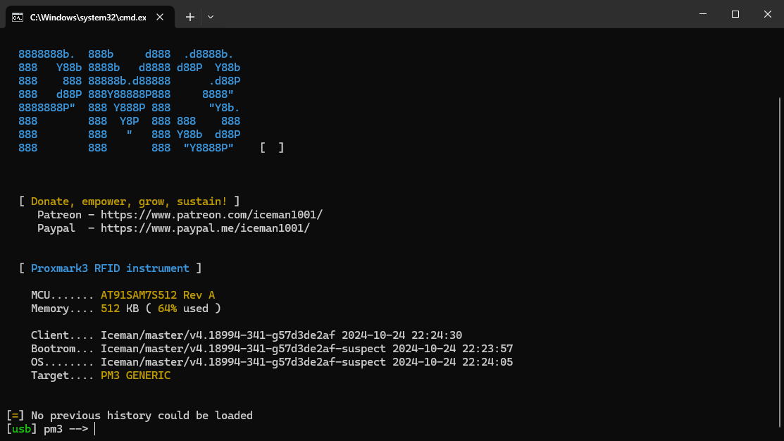 为 Proxmark3 刷写最新固件 发表于 2024-10-26 更新于 2025-11-23 分类于 RFID Waline: 阅读次数: 前言最近买了块proxmark3(居然还是microusb接口的,没想到2024年了还在用这种接口),想把固件升到最新,记录一下 几经周转,找到了这个网站 Proxmarkbuilds.org 这网站里有最新的pm3 windows客户端二进制文件,正好不用自己编译了 刷写固件非常的…简单,只需要双击这个文件: 就会出现 此时插上pm3就行了 全程不需要手动操作 再次打开客户端,已经是最新版了 使用这还用教?直接hf mf autopwn一把梭